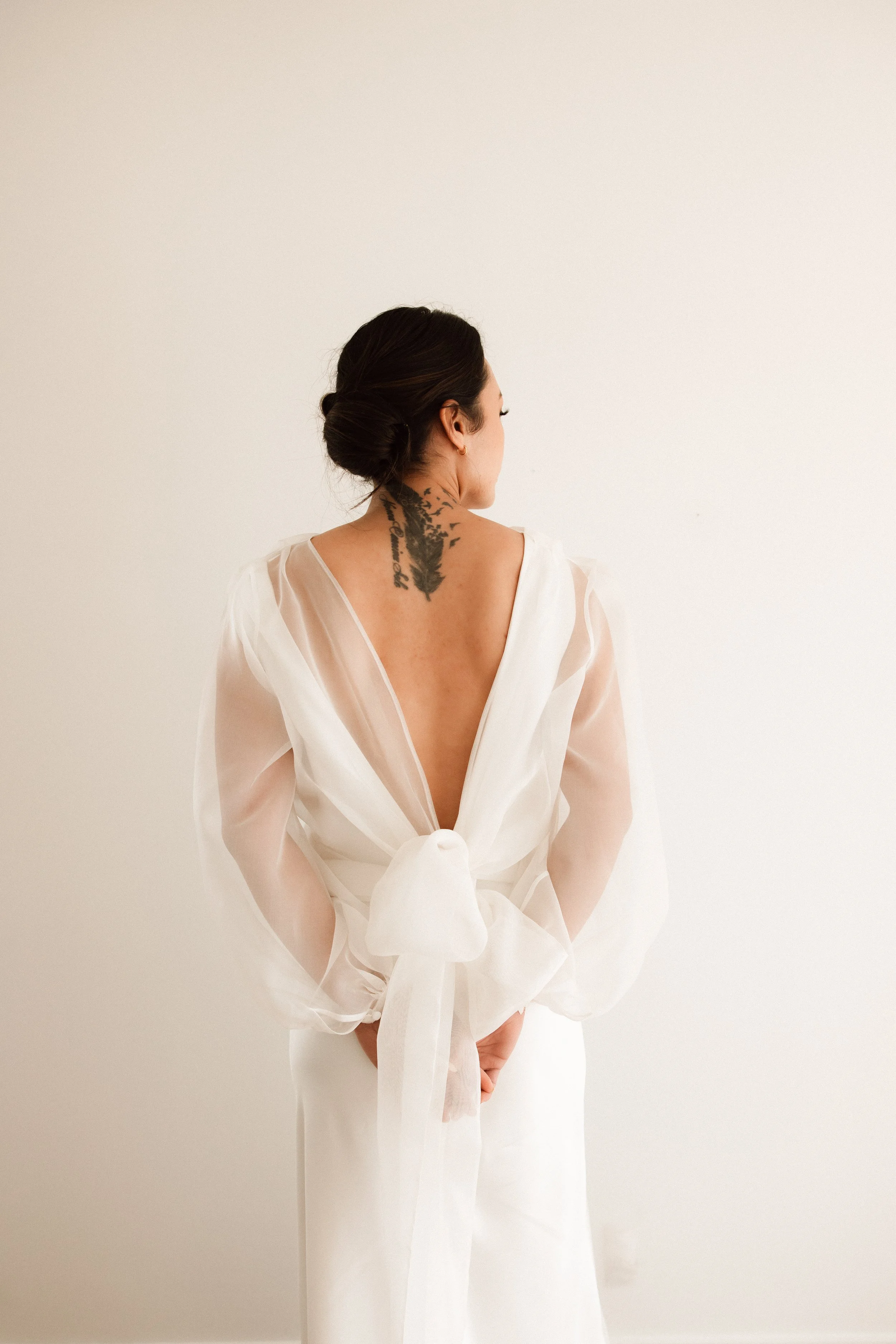 Elevate your wedding ensemble with the enchanting Betty Blouse. The airy, translucent silk organza creates an ethereal feel, while the voluminous sleeves add a touch of drama.