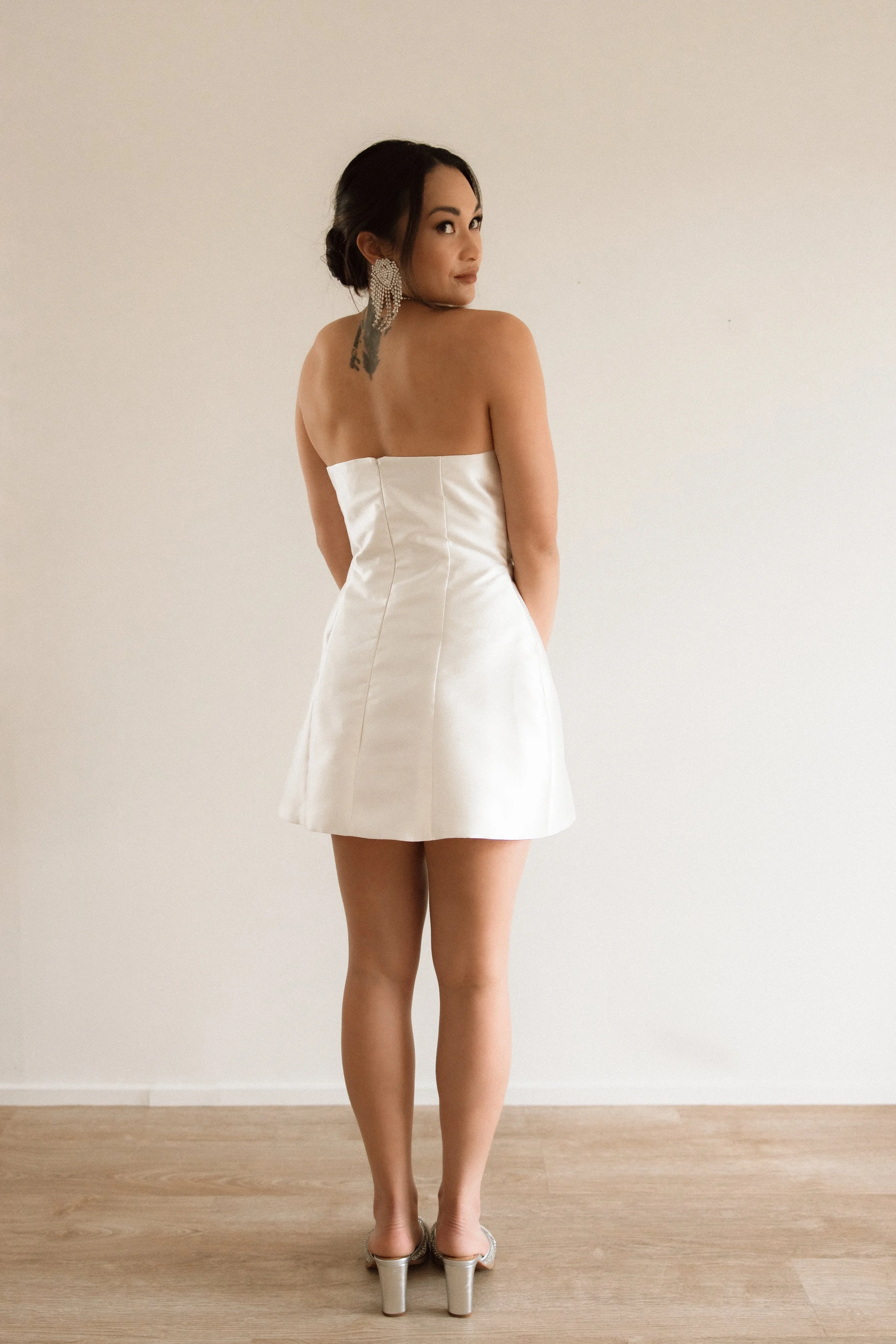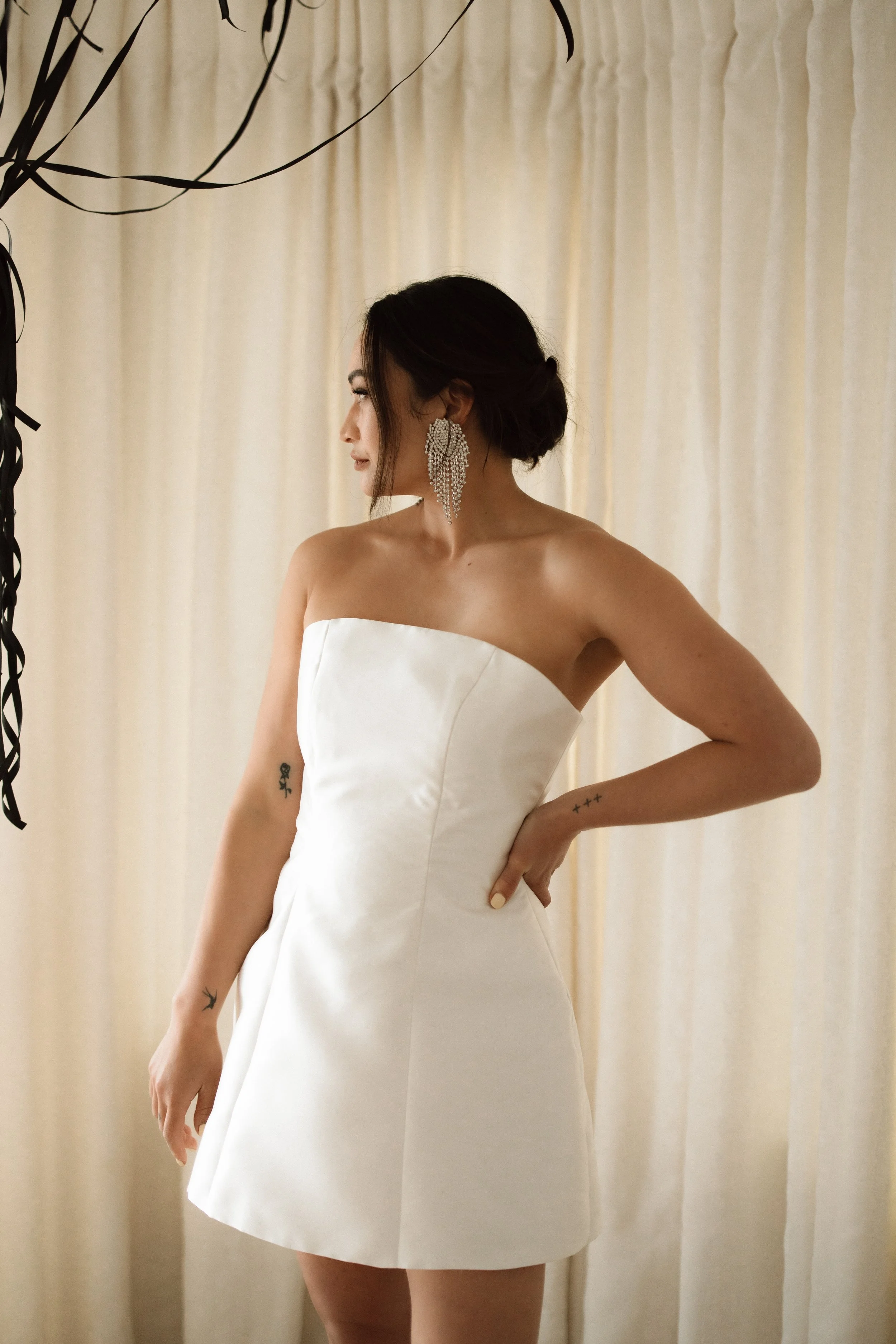 Dance into the night with Elle! Short and sweet, with clean, sculpted lines and luminous, structured fabric, Elle catches the light like moonbeams on a hot summer night. Effortlessly chic and designed to move with you, she’s as comfortable as she is sexy. From cocktails to the dance floor, Elle is your go-to girl to party with all night long